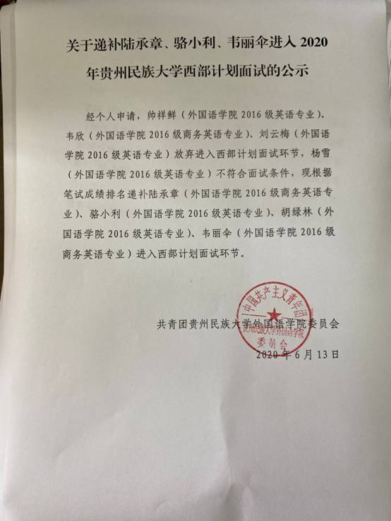 关于递补陆承章、骆小利、韦丽伞进入2020年贵州民族大学西部计划面试的公示